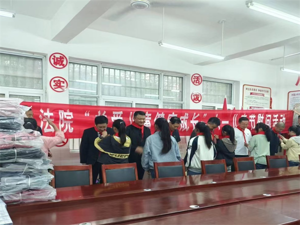 活動現(xiàn)場,學生代表為領導們佩戴紅領巾,朱廣平向全校少年兒童致以節(jié)日祝福,向辛勤工作在教育一線的教育工作者表示崇高的敬意和親切的問候。朱廣平勉勵孩子們要志存高遠、勤奮學習,努力用知識改變命運,爭做新時代好少年。隨后,為孩子們送上了書包、文具等慰問品,讓孩子們真切感受到黨和人民法院的關懷與溫暖。