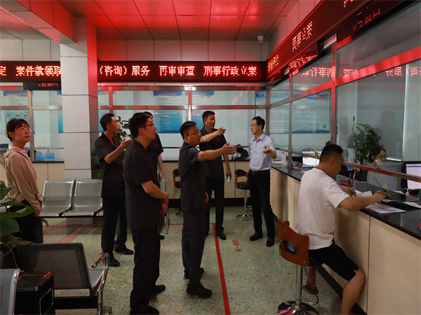吳志軍一行首先來到尉氏縣人民法院蔡莊法庭,查看法庭安檢設(shè)施、審判庭、干警辦公區(qū)及生活區(qū)等設(shè)施,聽取法庭“立審執(zhí)一體化”改革、參與訴源治理、無訟村(社區(qū))創(chuàng)建等工作情況,吳志軍對蔡莊法庭主動延伸審判職能,積極參與基層社會治理的作法予以高度評價(jià)。隨后,調(diào)研組又來到尉氏法院實(shí)地查看了訴訟服務(wù)中心、執(zhí)行卷管中心等場所,聽取訴服質(zhì)效、執(zhí)行權(quán)運(yùn)行機(jī)制改革等有關(guān)情況。