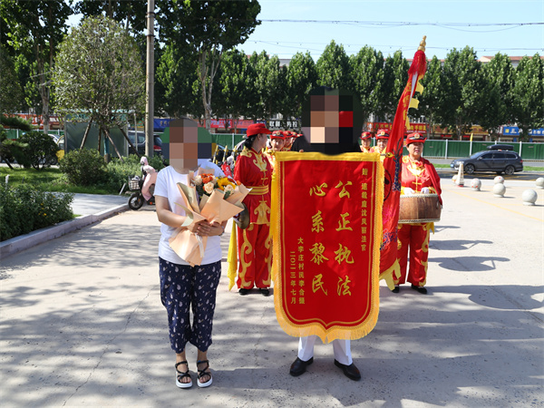 中新河南網(wǎng)7月8日電: “真的很感謝沈法官,使我的權(quán)益得到了保障,同時(shí)也讓我感受到了公平正義……”7月7日上午,開封市尉氏縣人民法院門前鑼鼓喧天。一面寫有“公正執(zhí)法、心系黎民”的錦旗送到沈鳳麗法官的手中,以此感謝沈鳳麗法官高效執(zhí)法、司法為民的公仆情懷。