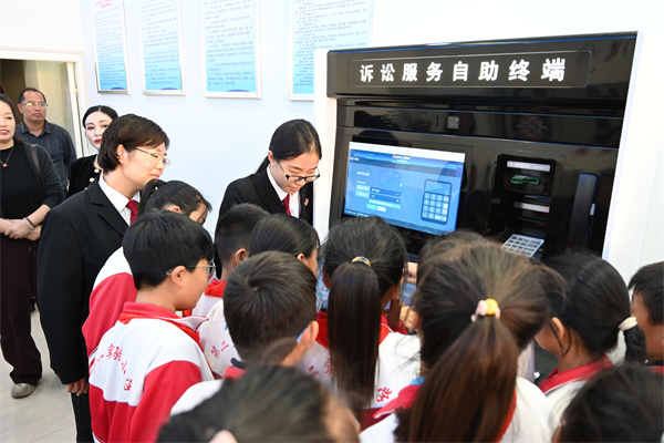 在訴訟服務(wù)中心,干警靳永朝為大家詳細(xì)介紹立案流程和窗口職能,并帶領(lǐng)同學(xué)們體驗訴訟服務(wù)自助終端設(shè)備操作,感受“一站式”訴訟服務(wù)的高效便利。
