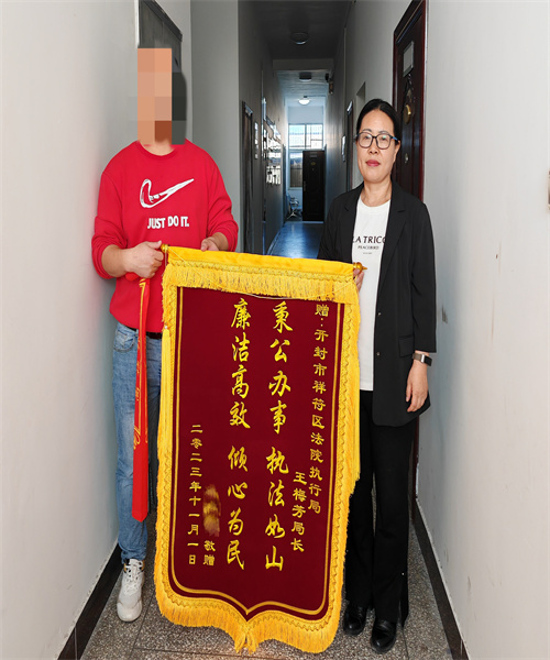 中新河南網(wǎng)11月4日電:“多少年了,本以為終本了的案件就沒人管了呢,但還是抱著希望來到終本續(xù)管團隊,終是沒失望,感謝法官的細心和不放棄,終于讓我們拿到一些賠償款……”申請執(zhí)行人王某家人心懷感激地說。近日,王某家人將寫有“秉公辦事,執(zhí)法如山;廉潔高效,傾心為民。”的錦旗送到河南省開封市祥符區(qū)人民法院執(zhí)行局局長王梅芳的手中。