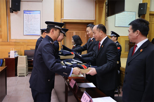 活動在莊嚴(yán)的國歌中開始,全體法警心潮澎湃,職業(yè)榮譽(yù)感和使命感油然而生。隨后,與會院領(lǐng)導(dǎo)為優(yōu)秀法警代表發(fā)放警禮服。今后,在重大紀(jì)念、慶典、外事等活動和禮儀場合,司法警察將著警禮服亮相。