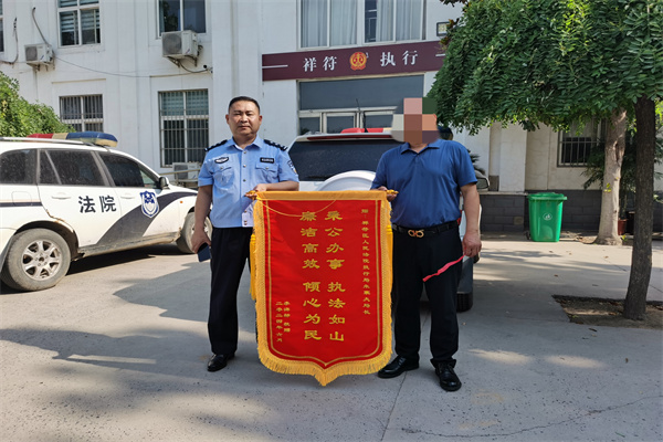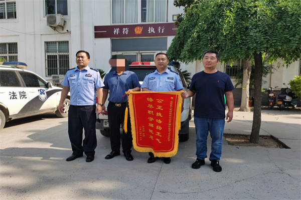 “朱局長(zhǎng),宗法官,我只是打了“執(zhí)行110”的值班電話,沒想到這大熱天你們頂著太陽(yáng)為了案件奔走,真沒想到你們出警這么快,......實(shí)在不知道說(shuō)啥好,一面錦旗表達(dá)感謝!”