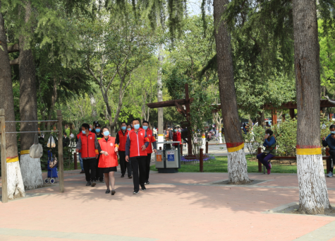 鄭州市五一公園是西區(qū)市民鍛煉休閑的重要場所,人流量大,防控任務重,為進一步加大新冠肺炎疫情防控措施,五一公園增加了公共設施和重點區(qū)域的消殺次數,各個出入口設置了防護欄,在服務站等處為市民配備了免洗手消毒液……,在消除病毒傳播隱患的同時,公園還成立了“疫情防控巡邏隊”,加強人員管理,巡邏隊在園區(qū)內不間斷開展疫情防控勸導工作,引導市民掃碼測體溫入園,對沒有或不會使用智能手機的市民進行信息登記;勸阻人員聚集,科學佩戴口罩;利用LED屏廣播等滾動播放疫情防控宣傳知識,提高市民科學防控意識;同時針對可能發(fā)生的緊急狀況,做好各項應對準備,一旦發(fā)現游客健康碼、體溫異常情況,將第一時間帶到臨時隔離點,做好周邊群眾疏散,迅速向上級部門匯報,用細實工作為市民群眾筑起疫情防控屏障。