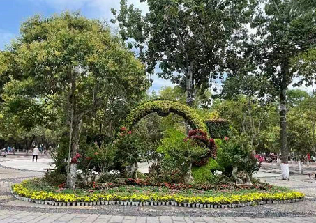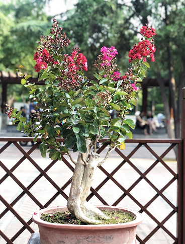 步入公園,10余個(gè)品種、5000余株紫薇在枝頭開得熱烈而奔放,紅的、白的、粉的、紫的......一簇簇,一叢叢,花團(tuán)錦簇,在夏日的微風(fēng)里搖曳生姿,讓人心醉。在公園西門入口處和中心廣場(chǎng),擺放的《年年有魚》、《云想花裳》兩組立體花壇奪人眼球,紫薇樁景錯(cuò)落有致地排列,紫薇樹干屈曲、枝葉繁茂、繁花朵朵,搭配各色時(shí)令花卉,組成公園優(yōu)美一隅;在紫薇大道,沿著游路擺放的80余盆花瓶造型紫薇和樹狀紫薇,造型優(yōu)雅、花朵嬌艷,花瓣隨風(fēng)搖曳,如詩(shī)如畫;最引入注目的紫薇盆景展區(qū),50余盆紫薇盆景及松柏類盆景,其造型或虬曲蒼勁、或蜿蜒盤旋、或古樸自然,耐人尋味。