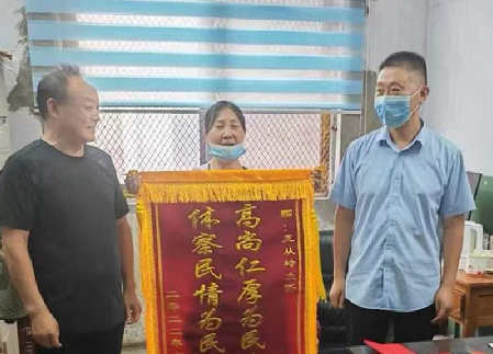原來,送錦旗的曹女士系鹿邑縣紡織品公司下崗職工。今年3月到法定退休年齡,因其在外務(wù)工期間正值疫情,無法返回家鄉(xiāng)鹿邑,待6月份疫情穩(wěn)定返回時(shí),其退休時(shí)間已超過3個(gè)月。曹女士不知如何是好,就前往縣人社局工人檔案室咨詢。檔案室主任王從嶺了解情況后,一邊安撫曹女士焦躁情緒,一邊按照規(guī)定指導(dǎo)其寫出申請(qǐng)。之后一段時(shí)間里,王從嶺等人積極與有關(guān)科室協(xié)調(diào),全力幫助曹女士辦理退休手續(xù)。7月初,曹女士的退休手續(xù)正式獲批。退休手續(xù)辦好后,曹女士深受感動(dòng),特意趕制一面錦旗,并冒著炎熱天氣送到縣人社局,以真心實(shí)意表達(dá)對(duì)人社干部的謝意。