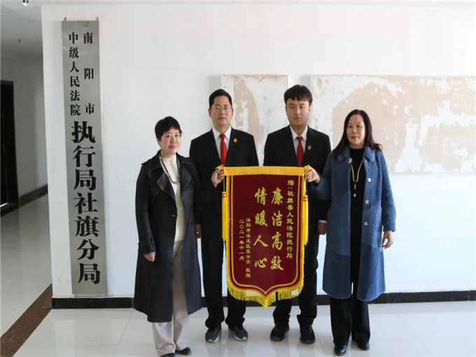 中新河南網(wǎng)11月22日電(李克選 陳立麗 王峰)“情暖人心,廉潔高效”——一面鮮紅的錦旗,一份沉甸甸的肯定,從洛陽送到社旗縣人民法院。 近日,經(jīng)過社旗法院宋興林執(zhí)行團(tuán)隊(duì)的不懈努力,一起責(zé)令退賠案件順利執(zhí)結(jié),來自洛陽某珠寶公司的法定代表人送上錦旗,難掩感激之情,激動地說道:“感謝法官幫我們主持公道,要不然這些‘寶物’可就打水漂了啊……” 2014年5月,楊某(系洛陽某珠寶公司股東)向李某借款150萬元,期限兩個月,該筆借款到期后楊某無力償還。李某等人為索要債務(wù),采取堵門、拉橫幅、噴大字、鎖大門等方式,嚴(yán)重?cái)_亂珠寶店經(jīng)營秩序,致使珠寶店無法正常營業(yè),造成重大經(jīng)濟(jì)損失。2014年8月,李某等人撬開珠寶店門,強(qiáng)行搬運(yùn)珠寶店內(nèi)玉器等物品,經(jīng)鑒定,被搬運(yùn)走的玉器價(jià)值46950元。該案經(jīng)法院審理判決李某將拉走的玉器返還給洛陽某珠寶公司。