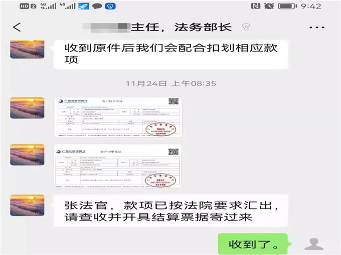 執(zhí)行干警按照申請(qǐng)人提供的企業(yè)賬戶線索,依法進(jìn)行了查詢,發(fā)現(xiàn)企業(yè)名下并無(wú)財(cái)產(chǎn)可供執(zhí)行,但執(zhí)行干警并未放棄,經(jīng)仔細(xì)研究,發(fā)現(xiàn)該化冶公司存在公司名稱變更歷史,且變更后的企業(yè)名下有一筆到期貨款,執(zhí)行干警立即將該筆貨款凍結(jié),但由于疫情原因無(wú)法去往當(dāng)?shù)剡M(jìn)行扣劃,于是執(zhí)行干警又通過(guò)電話與新公司的法務(wù)部部長(zhǎng)取得聯(lián)系,耐心做對(duì)方思想工作,告知其不履行生效判決的后果。對(duì)于經(jīng)營(yíng)者而言,賬戶被查封固然可怕,但企業(yè)信譽(yù)受到影響更是難以彌補(bǔ),會(huì)直接影響企業(yè)今后的經(jīng)營(yíng)活動(dòng)。經(jīng)過(guò)幾個(gè)回合的調(diào)解,終于功夫不負(fù)有心人,對(duì)方公司同意郵寄接收法律文書(shū),工作證等,并全額履行生效法律文書(shū)確定的義務(wù),案件得以成功結(jié)案。