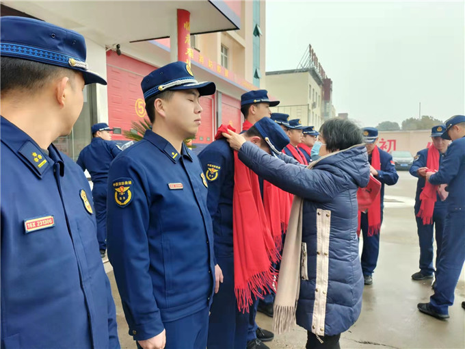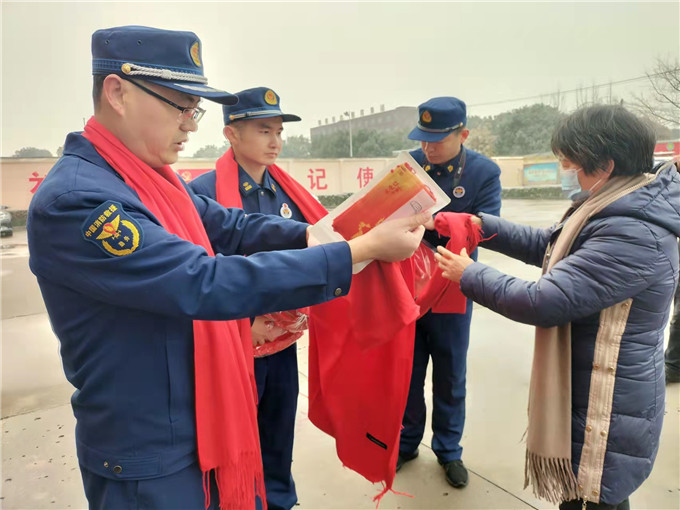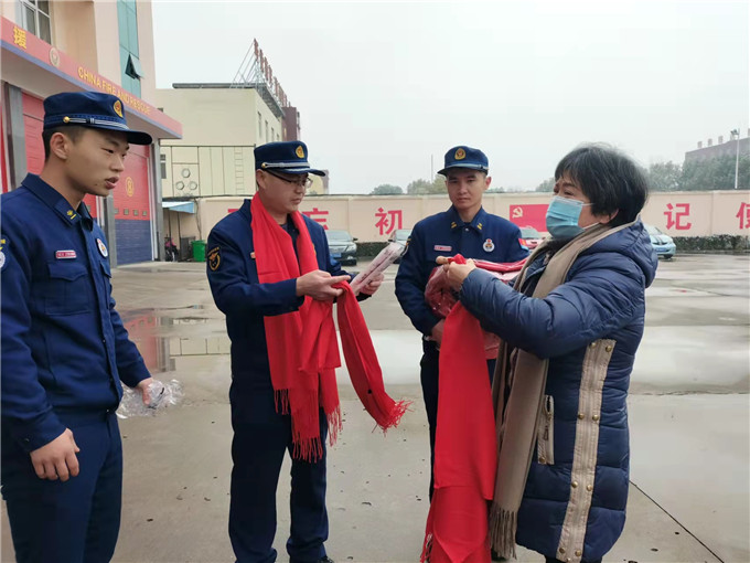 這位烈士母親拆開箱子,拿出一條條紅色的圍巾,逐人為官兵們圍上,然后對待孩子般為他們細心的整理。紅色的圍巾宛若紅色的火焰,在凜冽中傳遞著濃濃暖意。姚靜會飽含熱淚,她動情地說:“春節(jié)到了,做為大川的母親 ,我對部隊軍人有一種特殊的感情。軍人是一種特殊的職業(yè)。你們?yōu)榱俗鎳捕ê腿嗣裥腋,遠離家鄉(xiāng),遠離親人,來新野從事消防救援工作,我為你們感到光榮和驕傲。雖然我失去了大川,但看見了你們就好像又見到了自己的兒子。心里感到很欣慰!今天我買了點生活用品、小小一點心意來望大家。祝全體官兵新春愉快、身體健康、萬事如意!”