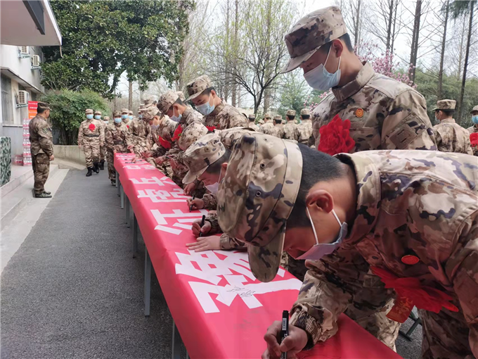 接著,新兵們面向黨旗做出莊嚴宣誓,堅決聽黨指揮,報效祖國。出席歡送會的領(lǐng)導為新兵們佩戴豫兵徽章和大紅花。鮮花映新孔,徽章閃魂魄,從這里新兵將踏上新的征程。接下來,新兵們在紅色長幅上莊重簽下自己名字,一諾千金來,盡顯報國志。