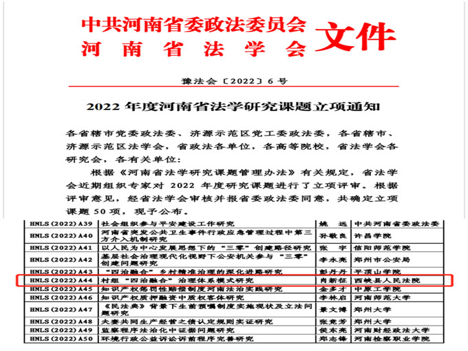 中新河南網(wǎng)4月12日電(李克選 王晶雅)近日,河南省法學(xué)會發(fā)布2022年度研究課題立項名單,由西峽法院黨組書記、院長肖新征主持申報的課題《村組“四治融合”治理體系模式研究》經(jīng)過層層評審成功入選,被確定為2022年度河南省法學(xué)研究課題。在本次被確定立項的50個課題的申報單位中,西峽法院作為全省三家法院之一,也是唯一一個基層法院榮列其中。