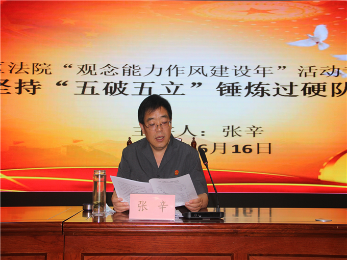 中新河南網(wǎng)6月16日電(李克選 李涵玉 魏錁)為推動(dòng)“觀念能力作風(fēng)建設(shè)年”活動(dòng)走深走實(shí),進(jìn)一步轉(zhuǎn)變司法理念和工作作風(fēng),提升干警整體素質(zhì),全力開(kāi)創(chuàng)法院工作新局面,6月16日,南陽(yáng)市臥龍區(qū)人民法院黨組書(shū)記、院長(zhǎng)張辛以《堅(jiān)持“五破五立” 錘煉過(guò)硬隊(duì)伍》為題講授了一場(chǎng)生動(dòng)而深刻的專題黨課。該院在家班子成員、審判委員會(huì)專職委員、中層正副職、各審判執(zhí)行團(tuán)隊(duì)的員額法官、執(zhí)行團(tuán)隊(duì)長(zhǎng)參加。