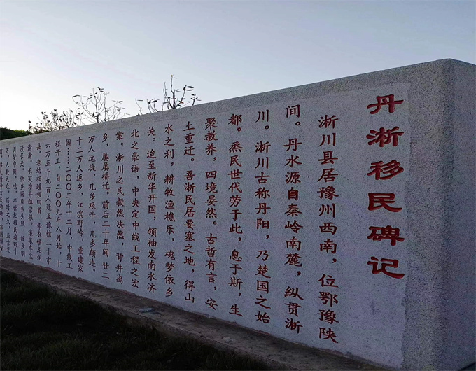 2015年,移民豐碑在魚關(guān)村原址落成,由56座高2米長8米厚0.4米重28噸的碑石組成,鐫刻了南水北調(diào)丹江口庫區(qū)南陽市淅川縣10鄉(xiāng)鎮(zhèn)184個(gè)行政村1276個(gè)村民小組的16.5萬移民的名字和移民遷安工作先進(jìn)單位和個(gè)人。